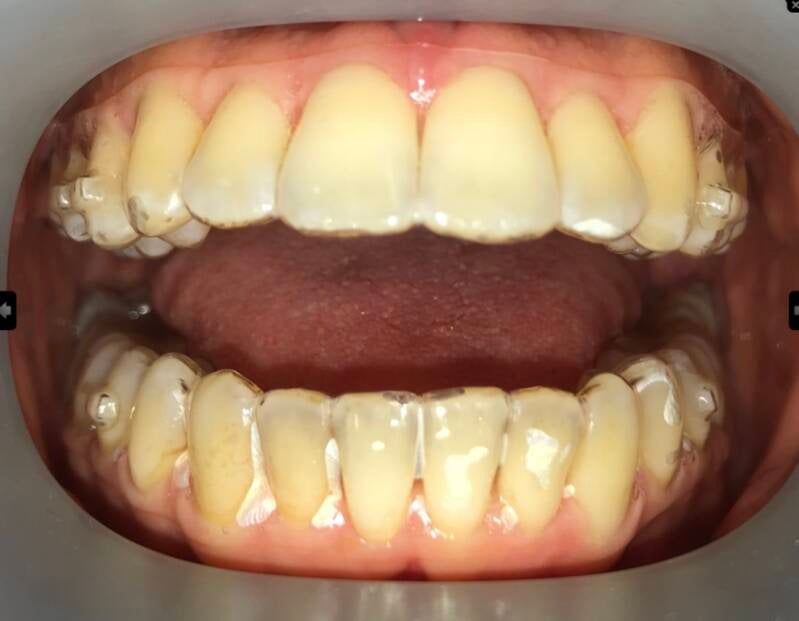 Je kunt zelf gemakkelijk zien of je aligners goed passen door naar je tanden in de spiegel te kijken. Ze sluiten perfect aan op al je tanden en kiezen. Er blijft geen ruimte over, zoals op de rechterfoto te zien is.